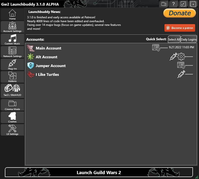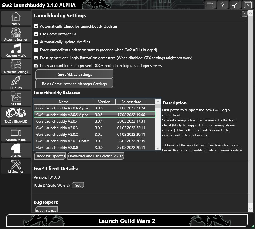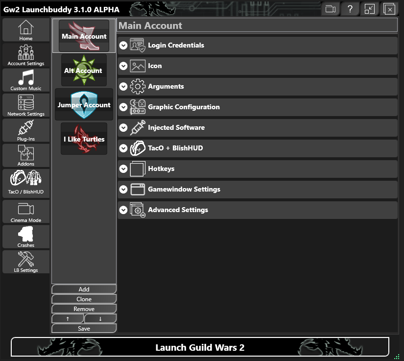 GW2 Launchbuddy is the most advanced game launcher for the video game Guild Wars 2. With over 250.000 total downloads, this open source project is constantly iterated and inovated to give the users an unparalled access to all of the games hidden settings